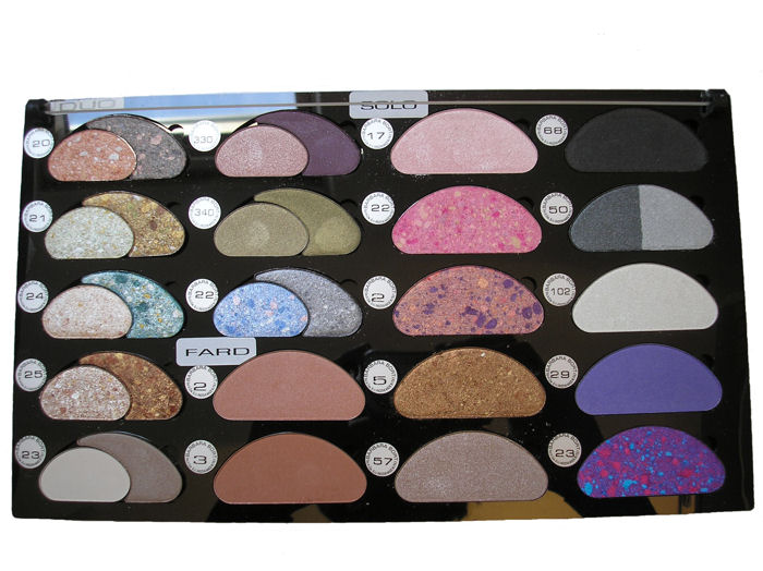 Choose from a combination of Duo and Solo Eye Shadows and Blush on. There are 47 solo colours, 19 duos and 15 blush on– colours including frosted and matte finshes. (see colour chart on eye shadow page).